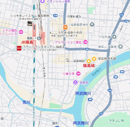JR福島駅から徒歩10分位の距離にあり、阿武隈 川沿いの県庁の位置にある。 お城らしいものは見当たらなかった。